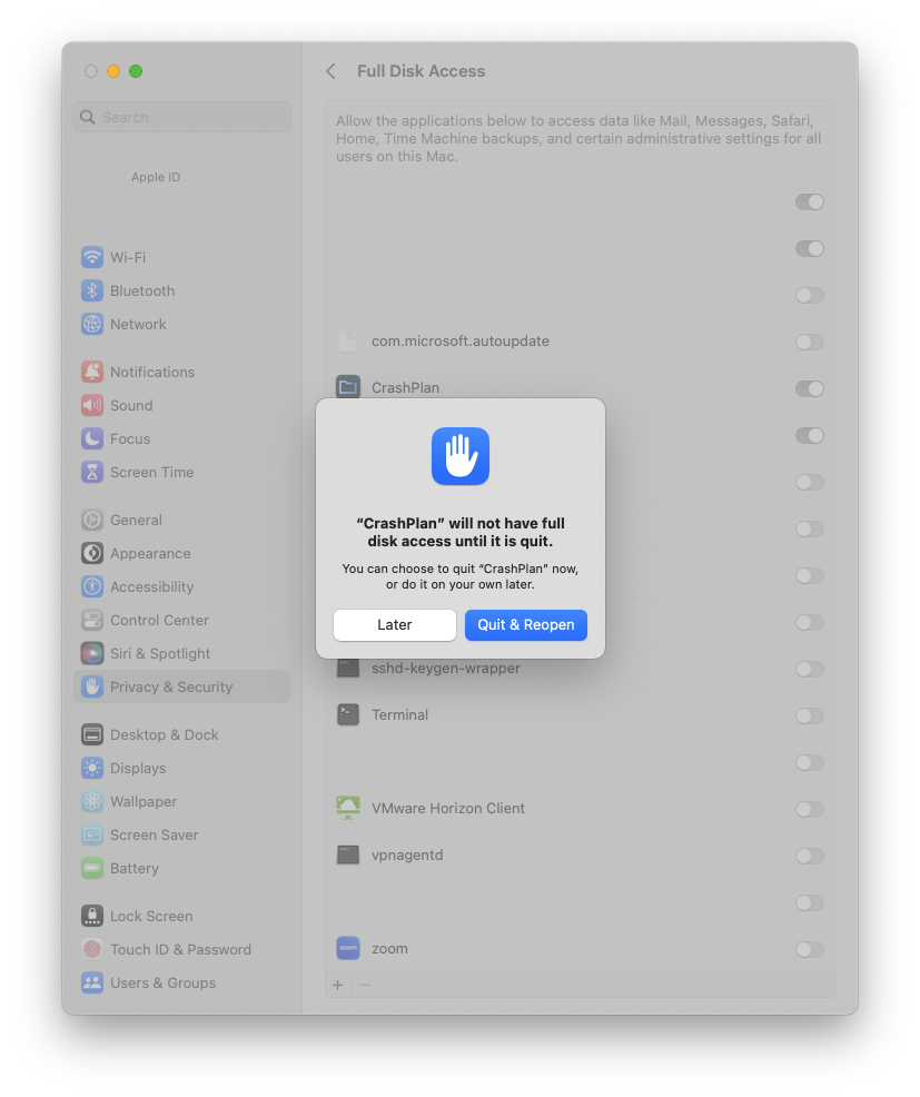 - Click Open. The following message will appear: "CrashPlan" will not have full disk access until it is quit.