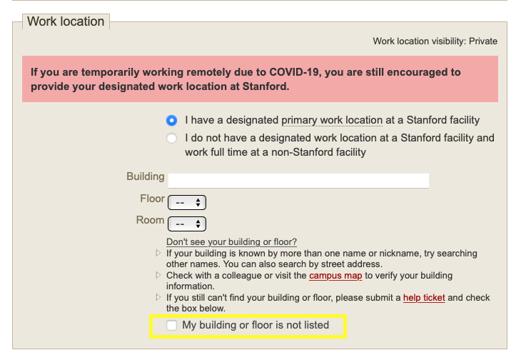 - Select the check box next to "My building or floor is not listed" (in conjunction with the selection for "I have a designated primary work location at a Stanford facility").