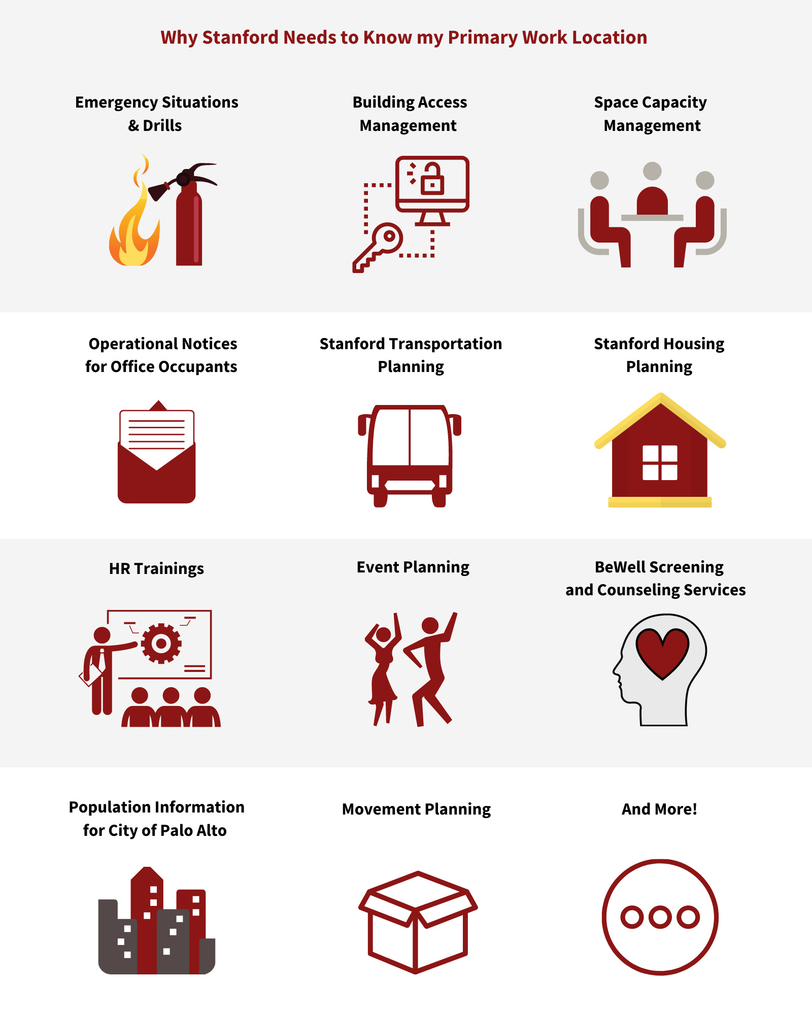 Documented primary work locations help the university to plan for and manage emergency situations and drills, building access, space capacity, operational notices for office occupants, Stanford transportation and housing, HR trainings, events, BeWell screening, counseling services, and more!