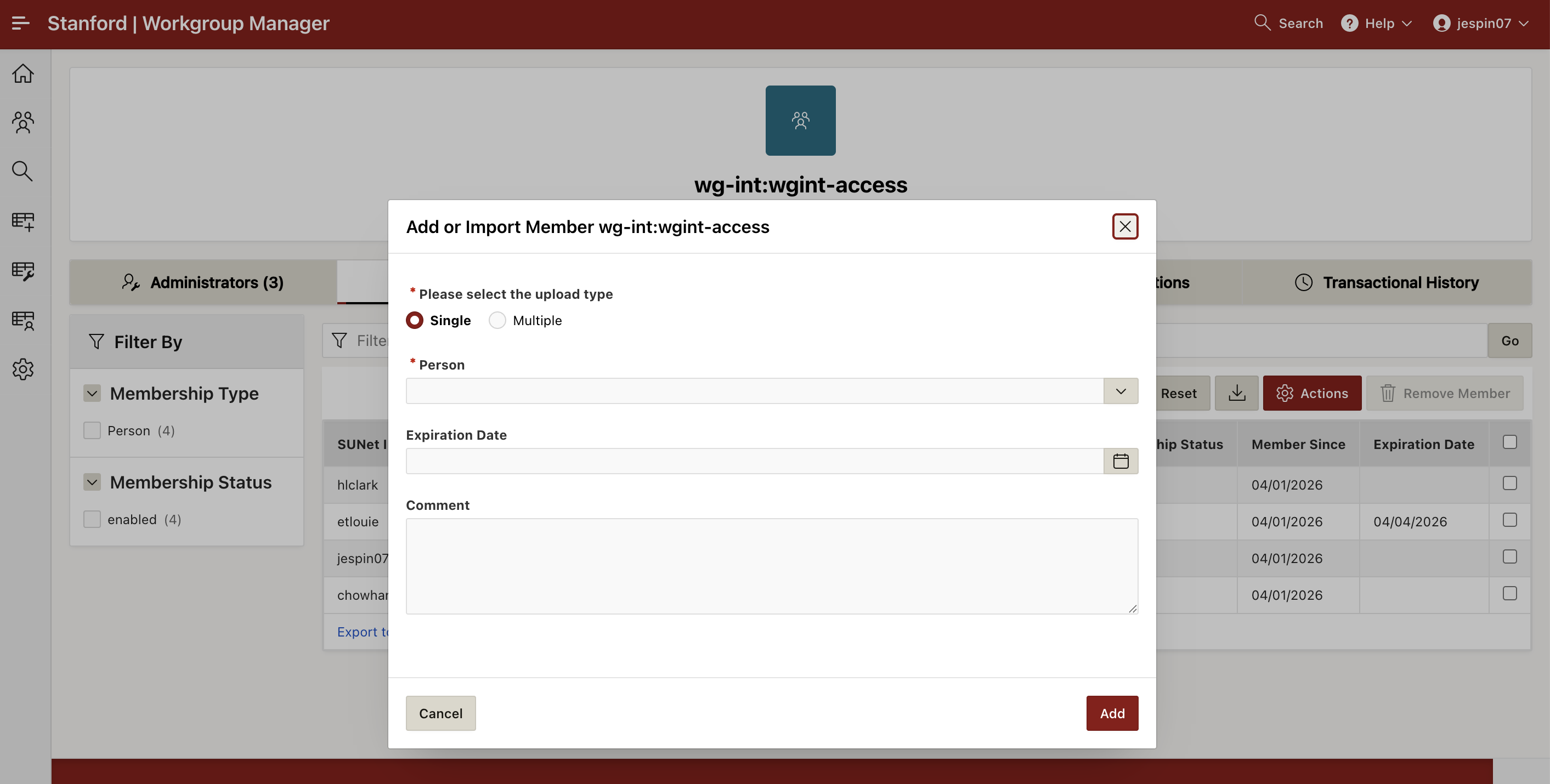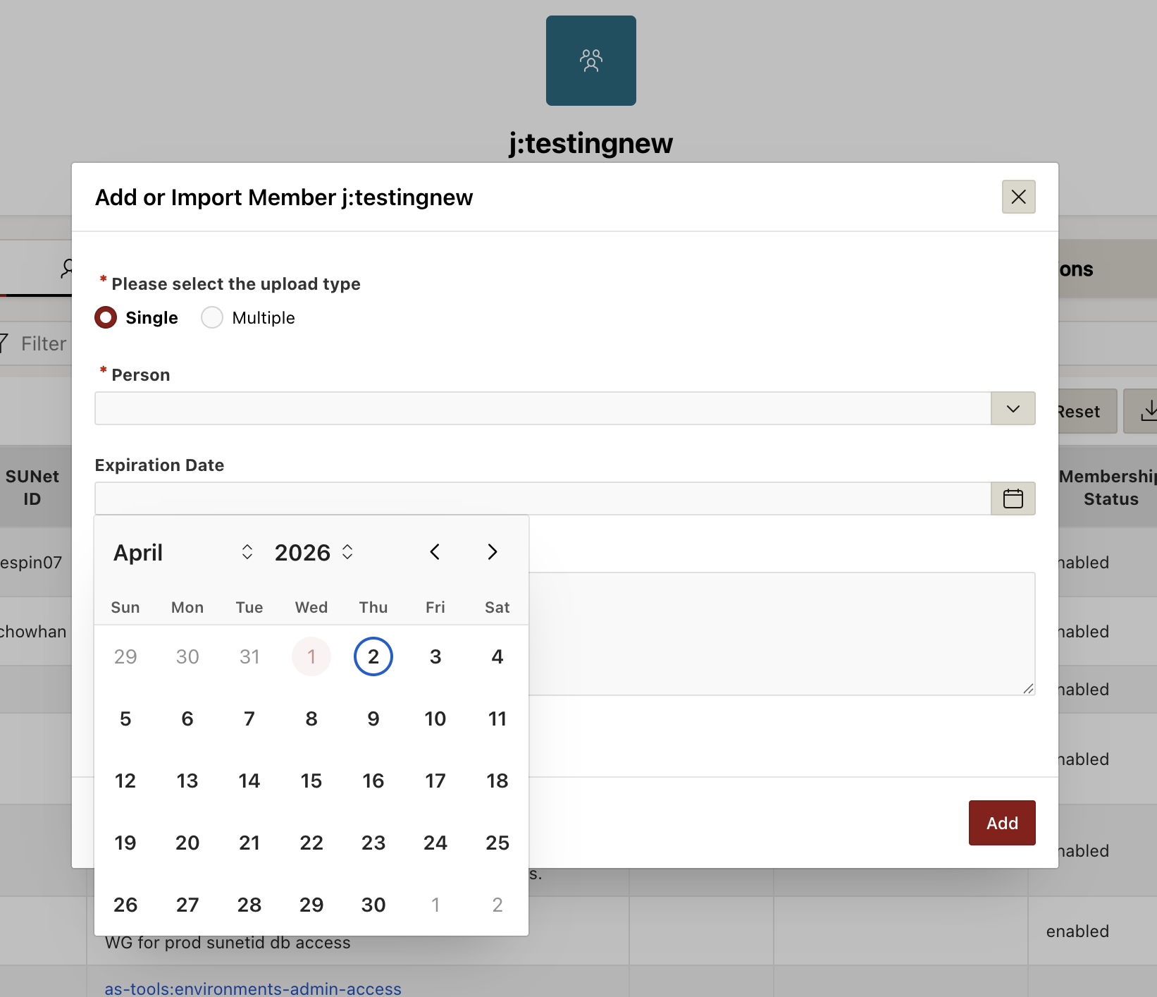 An administrator is now able to add an expiration date when adding new single or multiple members. Expiration dates are only allowed when adding members.