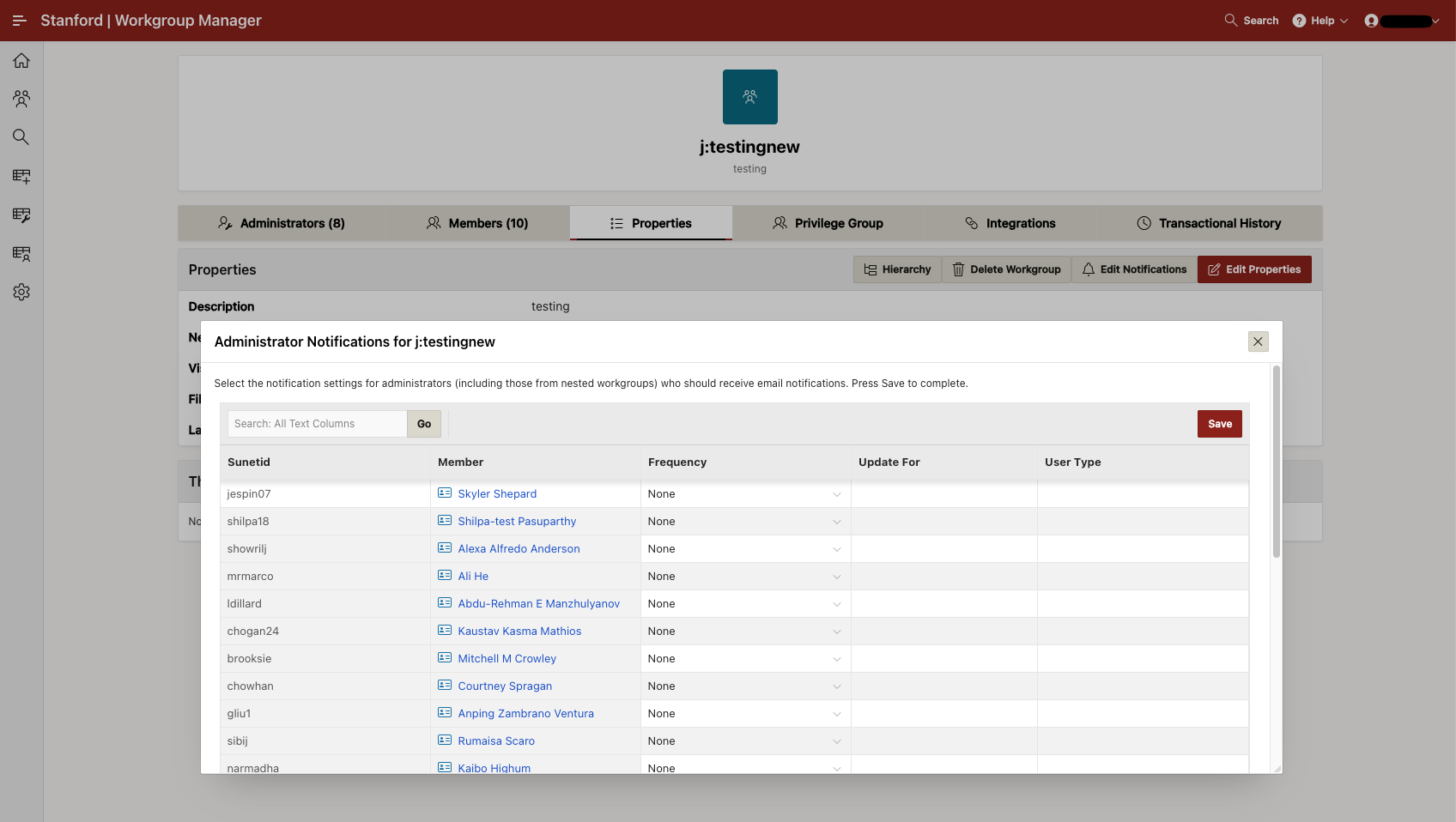 User Type: The administrator can select which notification types to receive: All, SUNet IDs, Certificates, or Nested Workgroups.