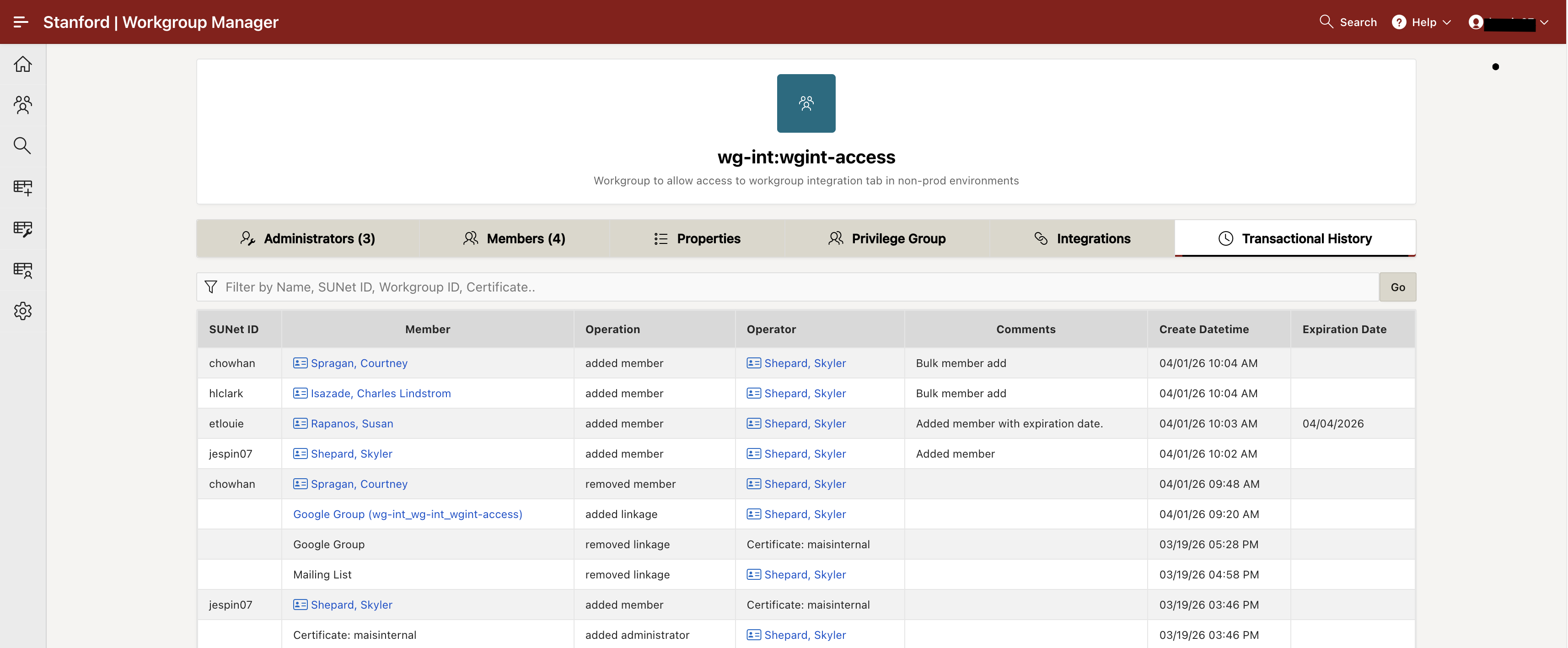 The transactional history tab is the main UI feature we are implementing. In this tab, users are able to see the history of a workgroup, such as, added members, removed members, adding linkages, removing linkages, comments added per operation, the time the operation was made, and the user (operator) of the operations.